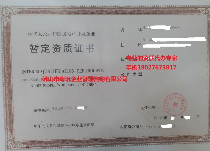 2018年3月份,在我公司的專業(yè)輔導(dǎo)指引下,我司佛山市順德區(qū)客戶房地產(chǎn)企業(yè)通過了房地產(chǎn)開發(fā)企業(yè)暫定級資質(zhì),提交資料后順利一周后獲得房地產(chǎn)開發(fā)企業(yè)資質(zhì)證書,受到客戶的好評!小編在這里宣傳一下,以后佛山五區(qū)南海區(qū),順德區(qū),禪城區(qū),三水區(qū)和高明區(qū),還有廣州,東莞,深圳,中山,江門,珠海,肇慶等地區(qū)的房地產(chǎn)開發(fā)企業(yè)公司,要辦理房地產(chǎn)開發(fā)企業(yè)資質(zhì)(包括暫定資質(zhì),四級資質(zhì),三級資質(zhì),二級資質(zhì),一級資質(zhì)),都可以找我們公司輔導(dǎo)辦理!